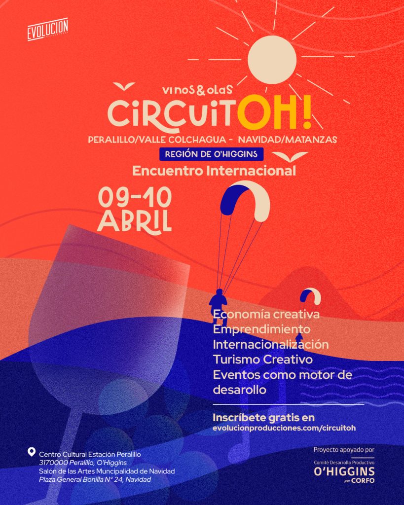 CircuitOH! es un evento que promueve el desarrollo turístico de la Región de O’Higgins a través del turismo creativo. Esta edición reunió a expositores internacionales, líderes del sector, emprendimientos locales y expertos en turismo, integrando el deporte acuático y el enoturismo como ejes de experiencia. Su propósito fue analizar los desafíos del destino y proponer soluciones innovadoras que fortalezcan la identidad y proyección de la región.